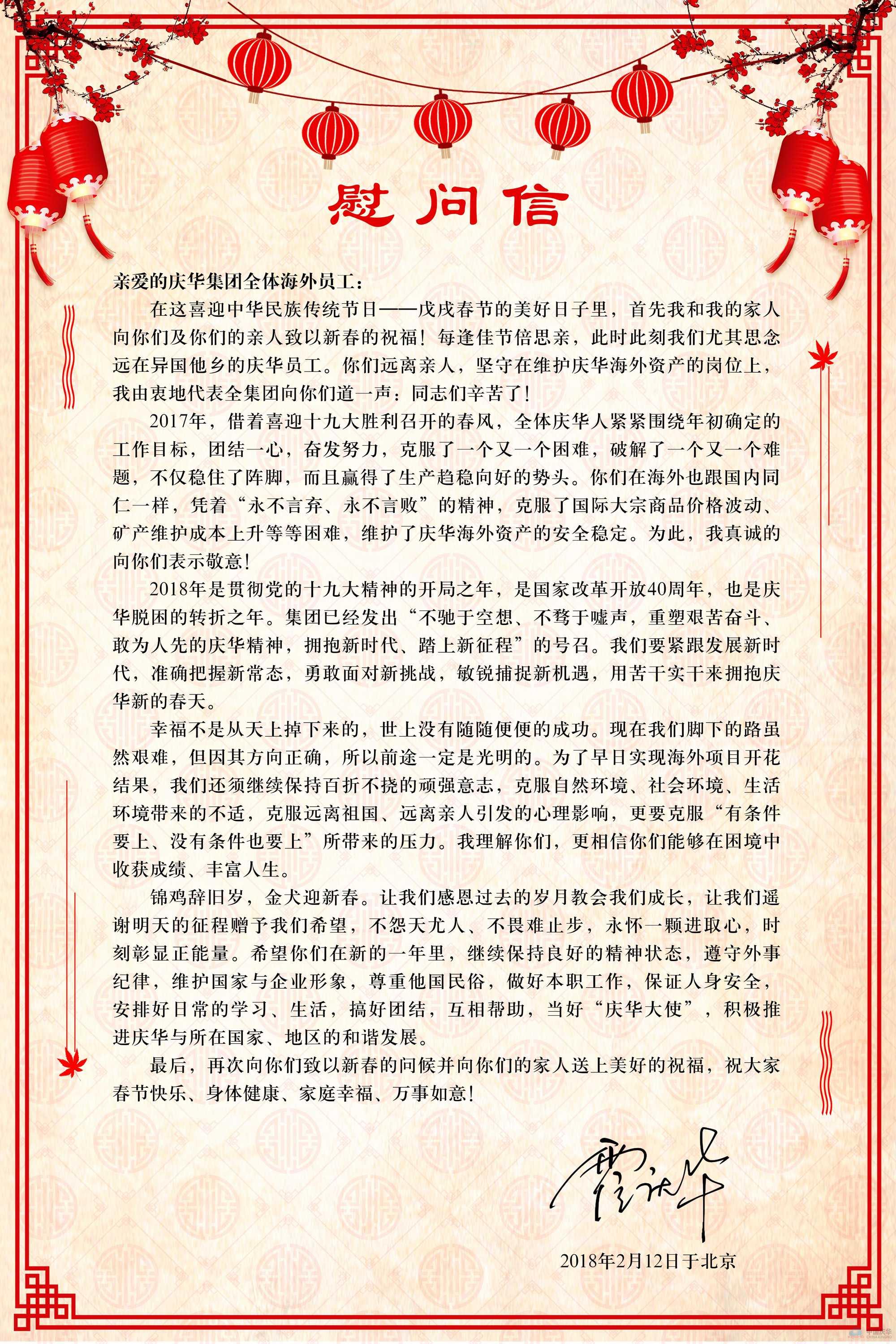 董事長(zhǎng)給慶華集團(tuán)全體海外員工的新年慰問(wèn)信